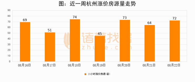 根据诸葛找房数据显示,杭州24小时涨价房源量为72套,较08月21日增加8套,环比上涨12.5%。与此同时,涨价房源占比小幅扩大,业主信心有所提升。