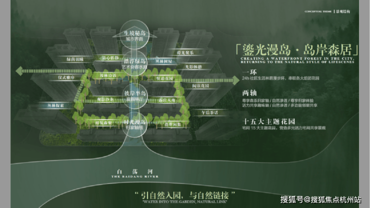 以“山水聚场”理念,规划“一环两轴十五园”景观布局,将水岸、岛屿、森林、花园、树屋作为园林节点,形成“行在景中、坐在岛中、游在林中、意在境中”的美学表达,营造出沉浸式山水活力场域。