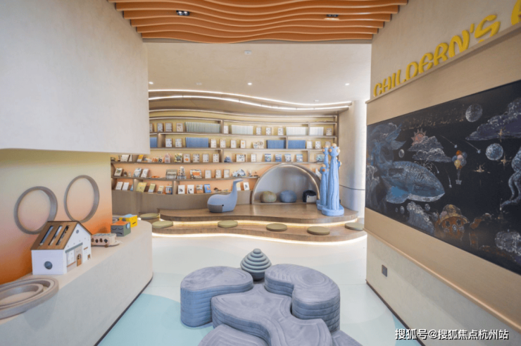 结合建筑、空间、自然环境关系,室内室外联动,呈现一个景观会客、海浪书屋、儿童休闲等多重功能的泛会所架空层,为全龄社交营造一个“有温度、有态度”的邻里空间。