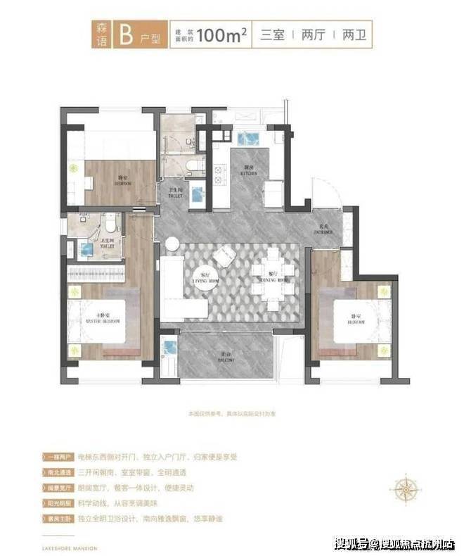 建面约100㎡三房,依旧是经典的飞机户型,大横厅设计,享受更阔绰的生活尺度,电梯对开门设计,配置独立电梯厅,拥有更多私享公共空间。