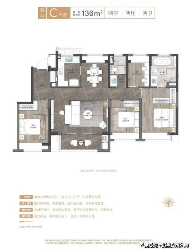建面约136㎡四房,四开间朝南,南北通透,短进深大面宽,采光、通风、景观俱佳,电梯对开门设计,配置独立电梯厅,拥有更多私享公共空间。