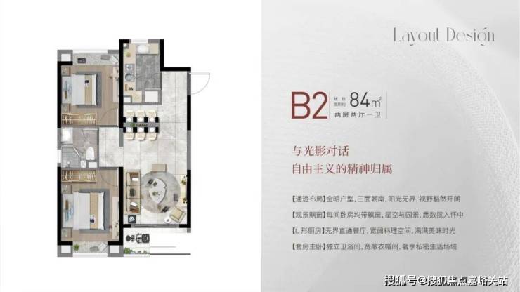 建面约99㎡3房2厅2卫,做到了三开间朝南+动静分离+南北通透+双卧室朝南+主卧套房设计+明厨明卫,室内通透明亮。