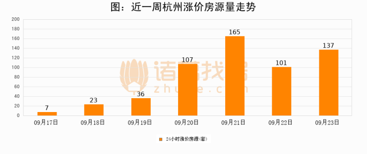 根据诸葛找房数据显示,杭州24小时涨价房源量为137套,较09月22日增加36套,环比上涨35.6%。与此同时,涨价房源占比小幅扩大,业主信心有所提升。