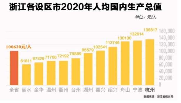 2020年人均GDP较高和较低依然为杭州和丽水,分别是136617元和61811元,相差1.21倍。