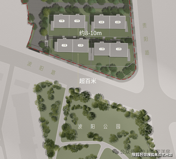 约10米Max楼距,尊享私密空间;头排超百米,后排约8-10米楼距,断层级尺度。