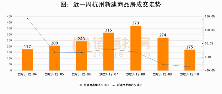 根据杭州市住房保障和房产管理局数据显示,2023年12月10日杭州新建商品房成交175套,较昨日减少99套,环比下降36.1%