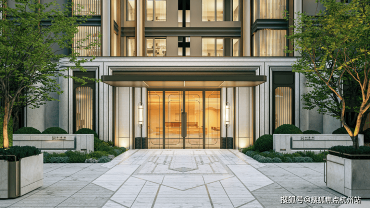 南侧风貌庭院式归家门庭,风貌建筑与精心雕琢的硬质景观和梧桐浓荫相互映衬,以大气庄重的迎宾礼序,彰显归家的仪式感。