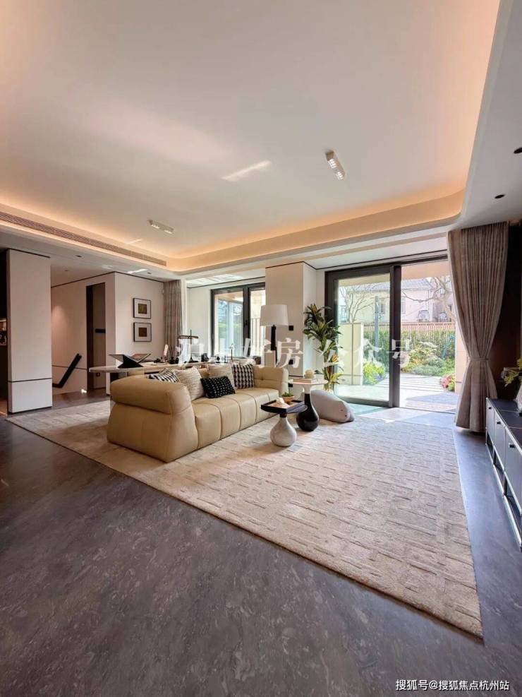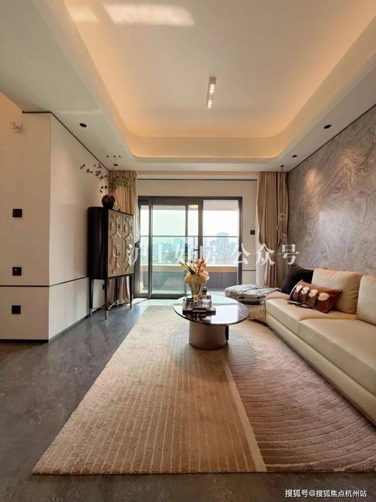 餐客厅是这个户型的一大亮点,其中客厅一眼看过去非常和谐。因为从花园到主卧门再到餐边柜,都做了木饰面,电视机背景墙采用的是“云起姑苏”的岩板。
