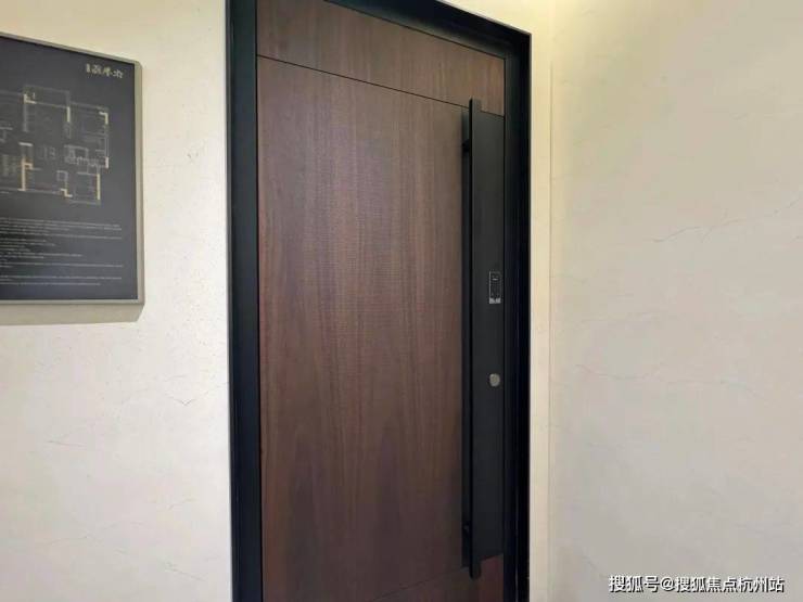 【国誉府】样板间做了F户型128㎡底楼复式和141㎡顶楼复式户型,其中建面约128㎡是三开间朝南户型,入户门从外头看是深色的,转入室内,为了统一视觉效果,门内改成了浅色。
