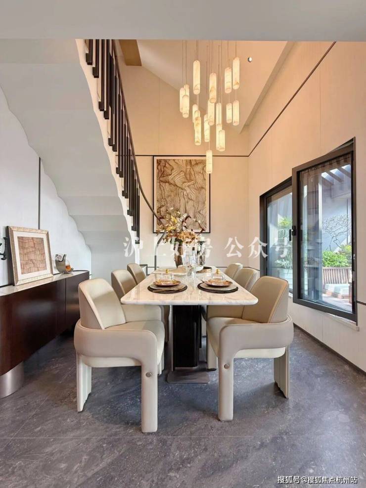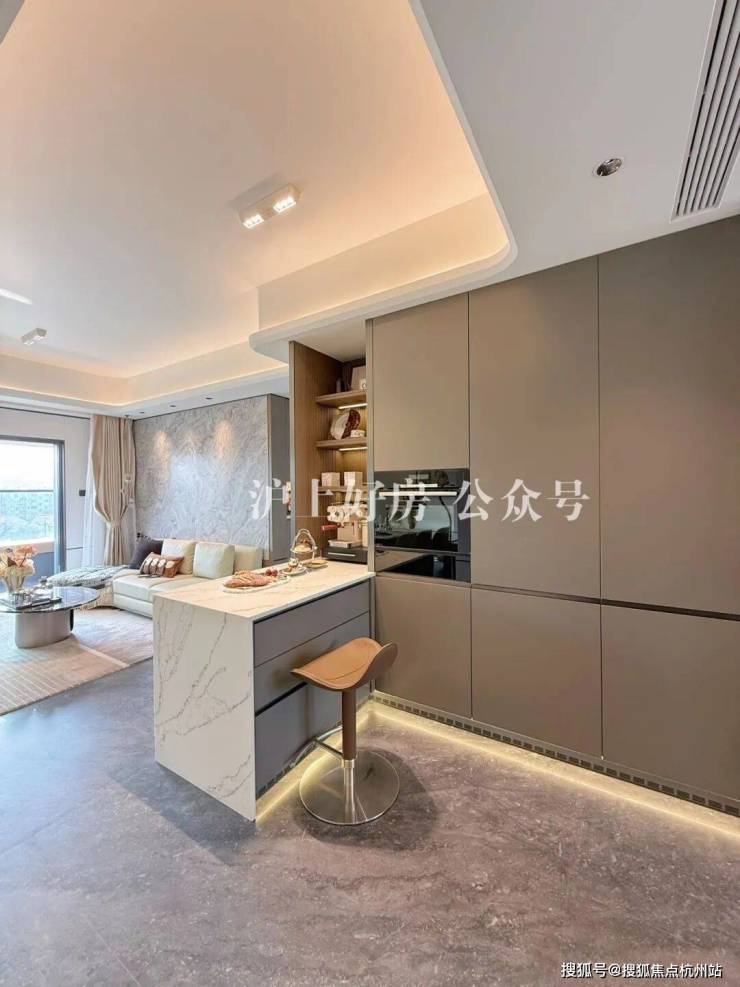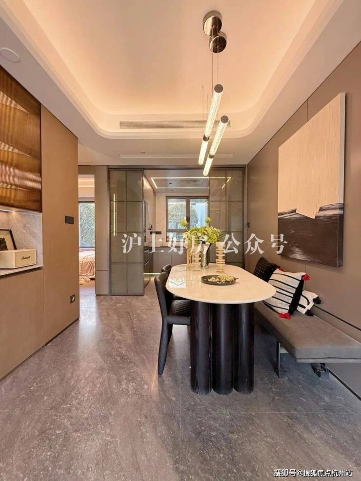 餐厅空间目前放的是4-6人长桌,小编现场估摸着放个一米左右的圆桌是可行的。这个餐边柜的开放格采用了鱼肚灰石材装饰也是交付标准之一。