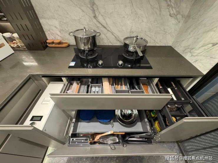 厨房收纳是小编觉得非常实用的款式。比如蒸烤一体机上方的橱柜做了一个下拉篮,下拉后的高度,一个一米六个子的人无需踮脚即可拿到东西。