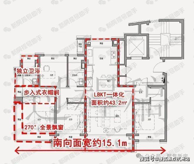 1、空间革新:四开间朝南,南向面宽高达约15.1m,采光面充足,景观视野开阔!LDKB一体化设计尺度奢阔!面积达约43.2㎡!超广阳台采光及通风效果MAX!年轻父母用嵌入式烤箱准备Brunch,老人在阳台晒太阳听鸟叫,孩子趴在腿边畅想未来