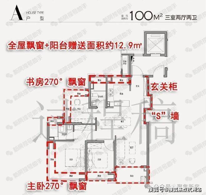 3、空间升级:超配双270°飘窗格局!市面上很少会有主卧及书房均设计270°飘窗的百平户型,稀缺性不言而喻~