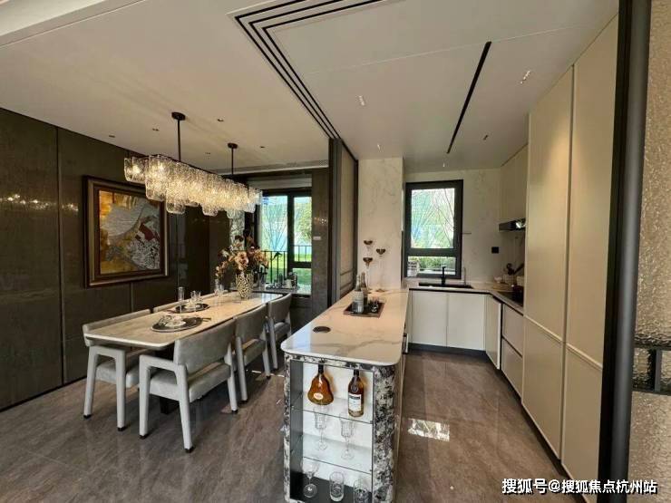 招商中旅·观境的解决方案是 “零无效空间” 。通过整合餐客厨等公共区域厅,将原来南北厅中间的走廊空间融合到使用空间中,减少过道的面积,避免碎片化的空间带来的冗余浪费。大面宽,短进深,餐厅与客厅横向相连,每一平方米都物尽其用,把客厅升级为家庭互动主场。