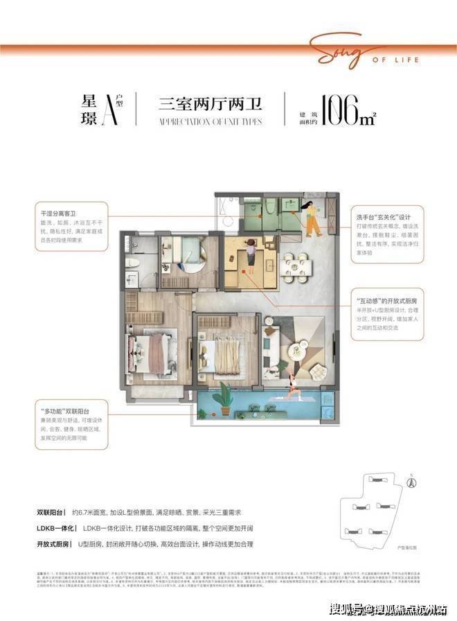 约106㎡户型点评:双联阳台约6.7米面宽,加设L型俯景面,满足晾晒、赏景、采光三重需求,LDKB一体化设计,打破各功能区域的隔离,整个空间更加开阔,开放式厨房U型厨房,封闭敞开随心切换,高效台面设计,操作动线更加合理!
