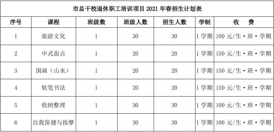 《杭州市总工会干部学校退休职工培训项目2021年春招生简章》今天公布,2021年春,学校共开设线下课程6门,6个班级,共150名学员,面向全市招生。赶紧看看今年有哪些课程!