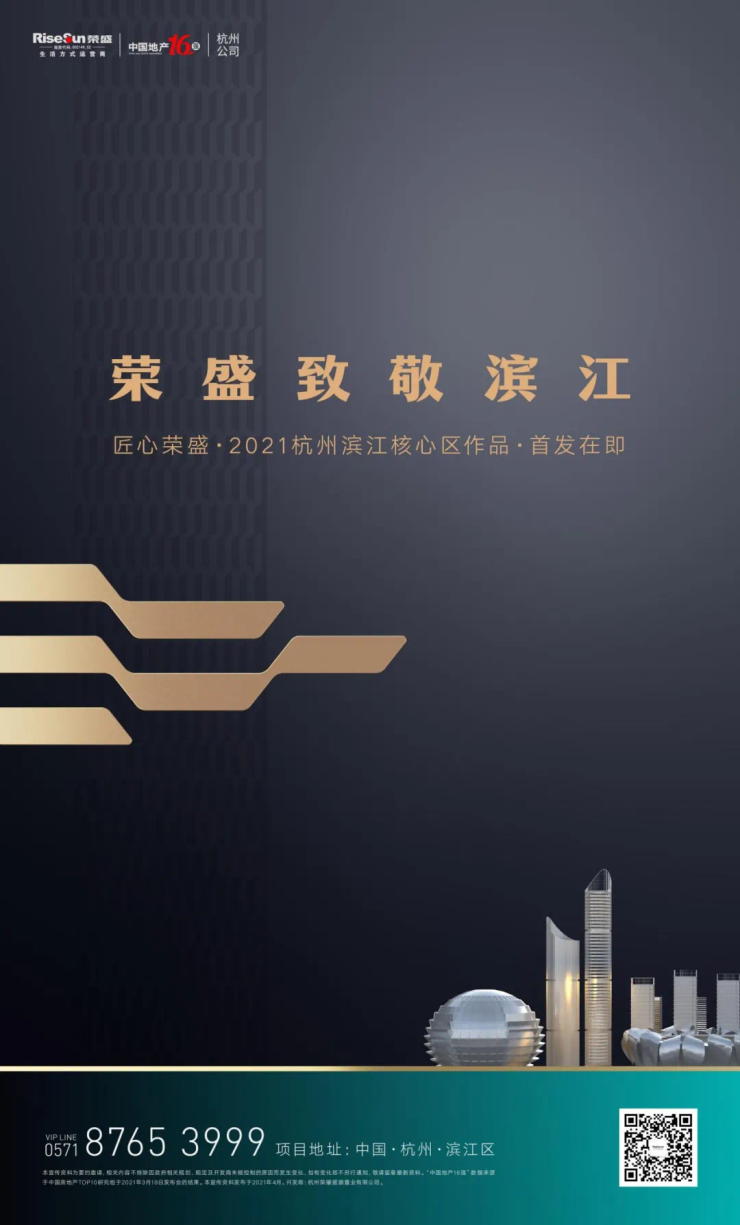 本宣传资料为要约邀请,相关内容不排除因政府相关规划、规定及开发商未能控制的原因而发生变化,如有变化恕不另行通知,敬请留意较新资料。本广告对项目周边环境、交通及其它配套设施的介绍,旨在提供相关参考,不意味着本公司对此做出了承诺,且并不完整表达周边所有相关信息。买卖双方的权利义务以双方签署的《商品房买卖合同》及政府主管部门批准文件为准。“中国地产16强”数据来源于中国房地产TOP10研究组于2021年3月18日发布会的结果。本宣传资料发布于2021年4月15日,有效期截止至2021年4月30日。开发商:杭州荣耀盛灏置业有限公司。