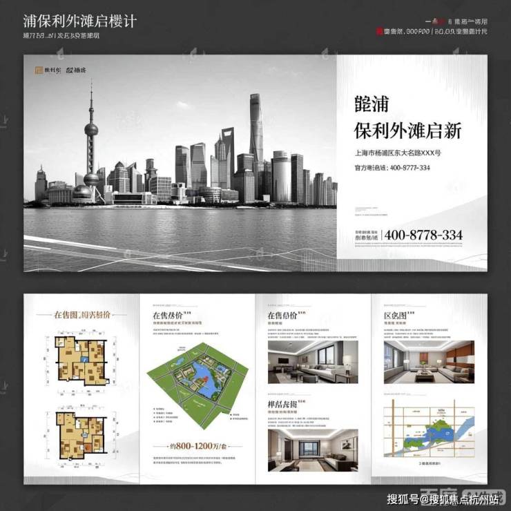 上海杨浦保利外滩启楼盘,风格统一为现代简约,包含地址、电话、户型图、房价、沙盘图、区位图、样板间、规划图、实景图等关键元素,以清晰信息展示为主。