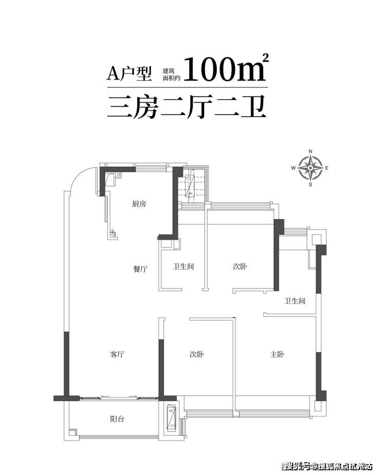 建筑面积约100㎡雅致三房两卫,满足二娃时代