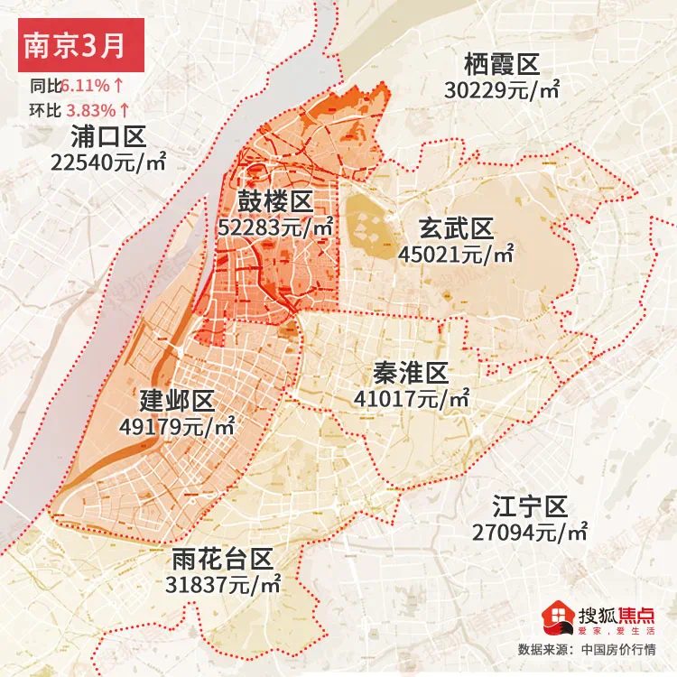 南京3月均价为33659元/㎡同比上涨6.11%↑,环比上涨3.83%↑