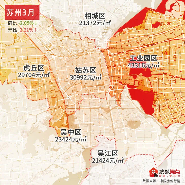 苏州3月均价为23207元/㎡同比下跌-2.05%↓,环比上涨2.21%↑