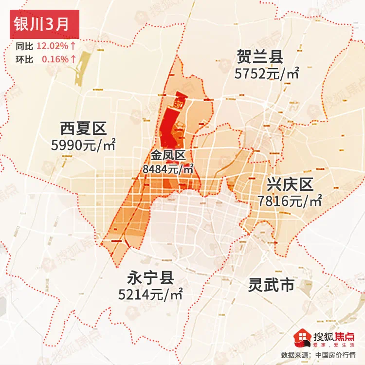 银川3月均价为7617元/㎡同比上涨12.02%↑,环比上涨0.16%↑