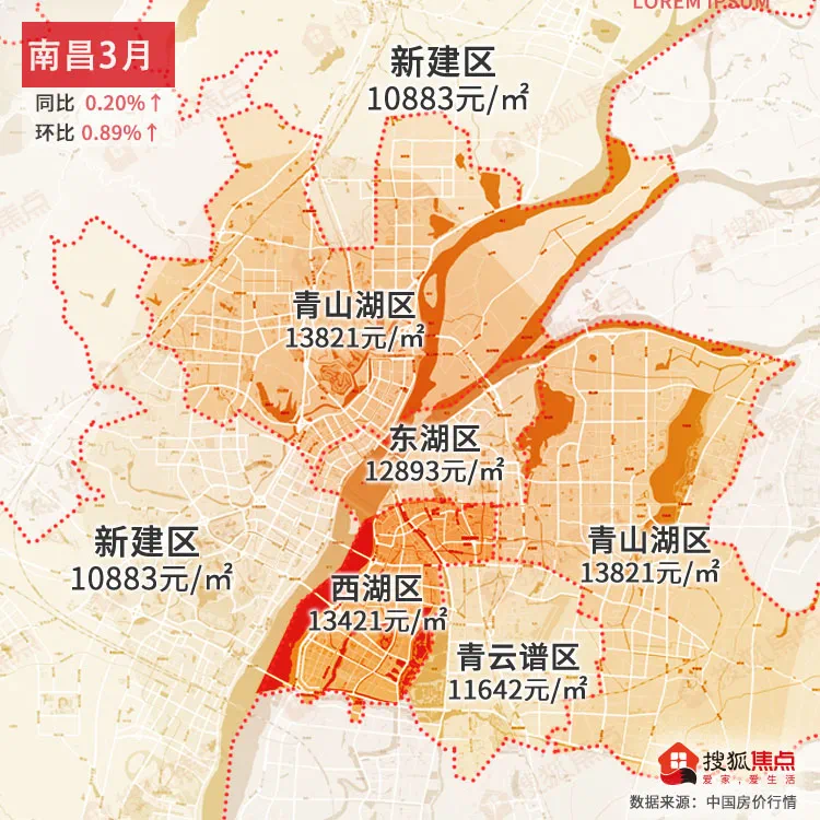 南昌3月均价为13129元/㎡同比上涨0.2%↑,环比上涨0.89%↑