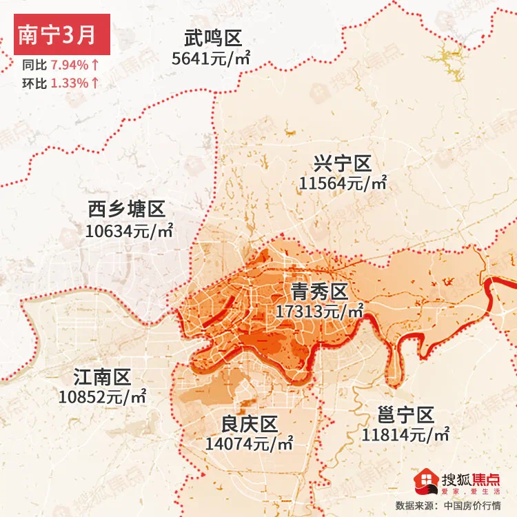 南宁3月均价为13948元/㎡同比上涨7.94%↑,环比上涨1.33%↑