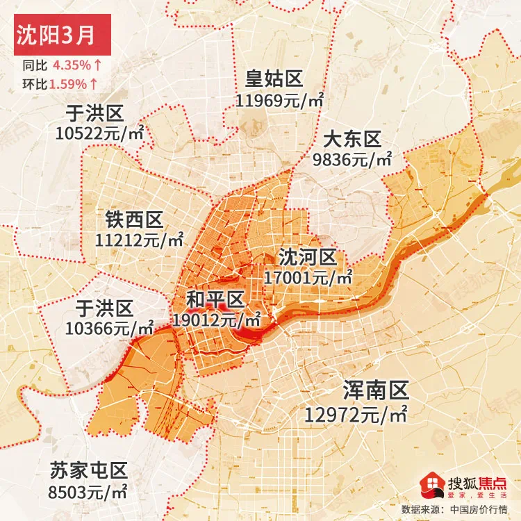 沈阳3月均价为12056元/㎡同比上涨4.35%↑,环比上涨1.59%↑