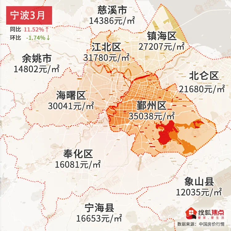 宁波3月均价为26556元/㎡同比上涨11.52%↑,环比下降-1.74%↓