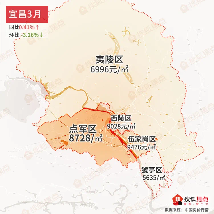 宜昌3月均价为7985元/㎡同比上涨0.41%↑,环比下降-3.16%↓