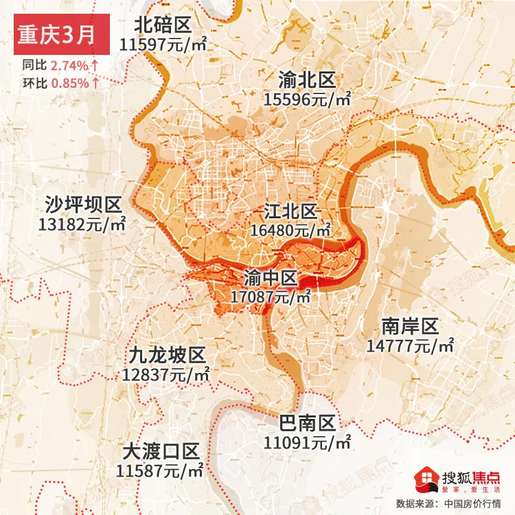 重庆3月均价为12921元/㎡同比上涨2.74%↑,环比上涨0.85%↑