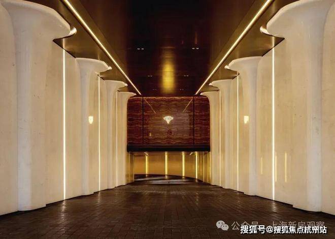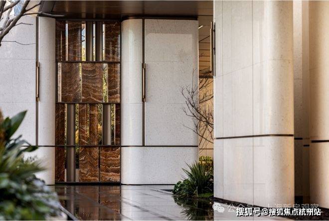 6、社区含“奢材”量很高。门庭延街的外立面,以精工定制弧形米色石材为主调,镶嵌典藏级老虎玉大理石,点缀古铜色现代海派艺术感灯器,整体呈现出百年海派的贵雅气质。