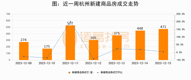 根据杭州市住房保障和房产管理局数据显示,2023年12月15日杭州新建商品房成交471套,较昨日增加23套,环比上涨5.1%