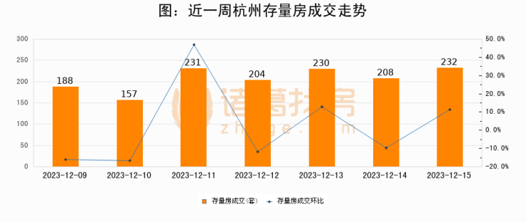 从存量房来看,2023年12月15日杭州存量房单日成交232套,比昨日增加24套,环比上涨11.5%。从近一周存量房成交来看,杭州存量房日均成交套数为207套,12月15日单日成交232套,高于近一周平均水平12.1%。