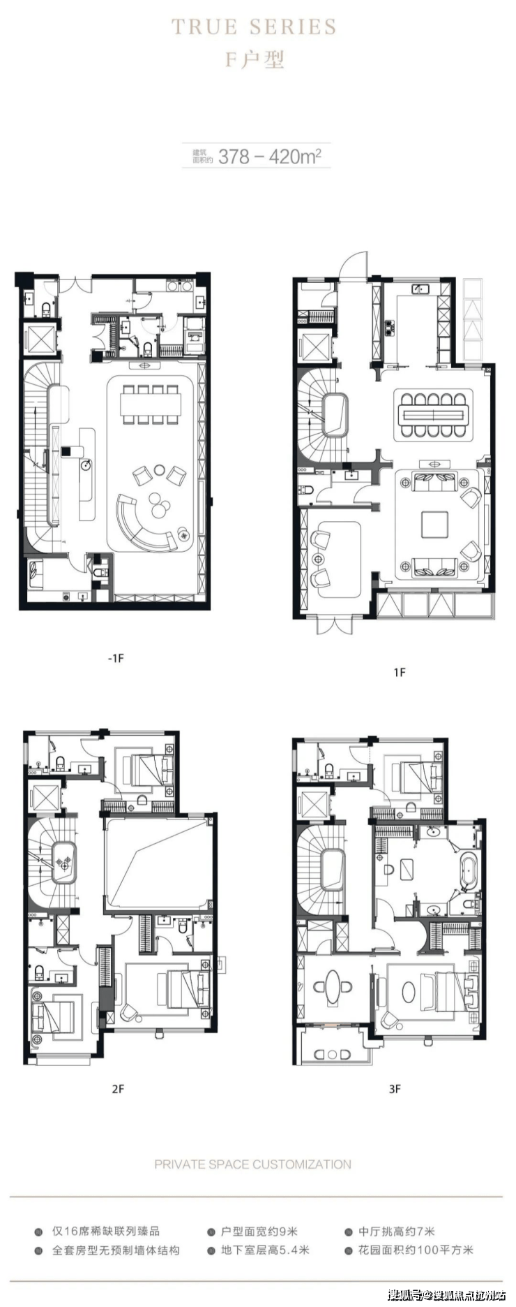 空间结构:地上三层(一层 3.6 米、二三层 3.4 米)+ 地下一层(挑高 5.4-6 米);每户带南北双花园(90-300㎡)、全景露台与双车库,地下室可灵活改造成影院 / 酒窖 / 健身房。
