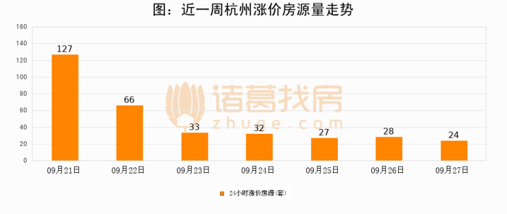 根据诸葛找房数据显示,杭州24小时涨价房源量为24套,较09月26日减少4套,环比下降14.3%。与此同时,涨价房源占比小幅回落,对于购房者来说是一个入市窗口期,购房者可抓住时机入市。