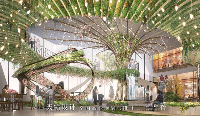杭庭这一商业空间设计方案,打造的是室内庭院式的约会圣地,将5-6层小中庭打造成开阔公共空间。咋一看满眼绿野,好像误入了仙境一般,消费者可以通过螺旋式爱情阶梯享受浪漫邂逅。生命之树恣意生长,远看绿色植被郁郁葱葱,近看繁花姹紫嫣红,一方超然尘世的精神角落瞬间点亮,心境也随之通透。