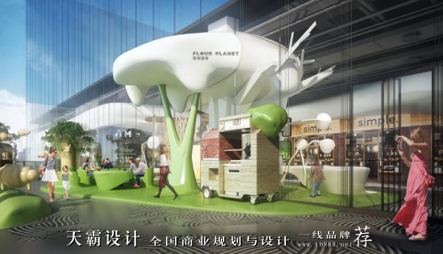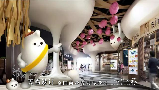 杭州大悦城的第三个主题街区,是荟萃全球精粹的面食博物馆“面都”。设计方案以“面”作为重要的设计灵感来源,融入到空间设计的平面、立面及景观之中。面粉团儿趣味化形象角色配合装修造型,作为空间主题形象入口,面条设计元素散布于空间各处,打造出“面粉星球”的空间概念。