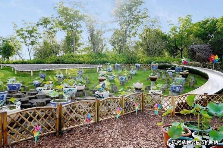 绿地里还有蹦床、树桩、铁质滑梯等组成的儿童游乐区。孩子们可以在高高低低的树桩上尽情玩耍,释放活力。