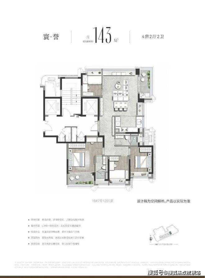 建面约143㎡四房来说。全明格局,四开间朝南,南向面宽最高达14.2米;LDKB一体化,客餐厅与厨房连通,互动性强,适合家庭聚会和日常活动;约92%的高得房率,居住体验感完全不输建面约160㎡大平层。