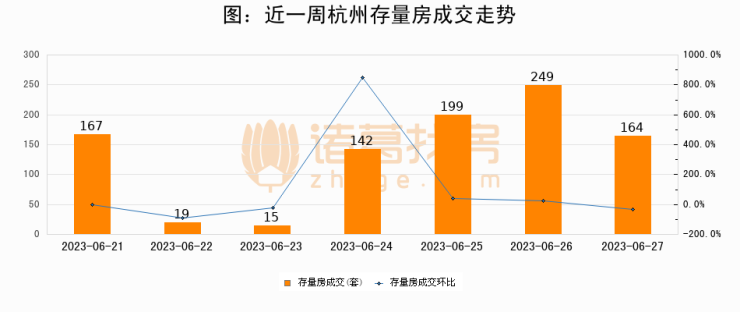 从存量房来看,2023年06月27日杭州存量房单日成交164套,比昨日减少85套,环比下降34.1%。从近一周存量房成交来看,杭州存量房日均成交套数为136套,06月27日单日成交164套,高于近一周平均水平20.6%。
