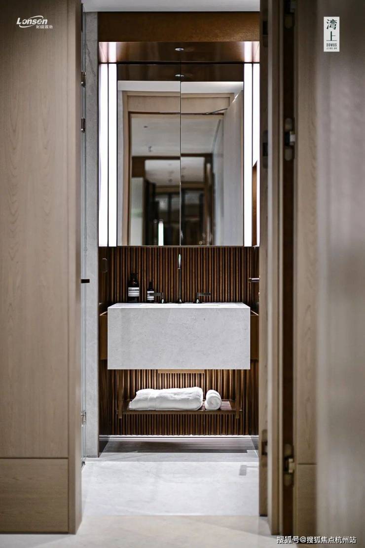 湾上采用地上+地下三层同标准精装入户大堂,大堂选用有着媲美艺术品表现力的亚马逊绿天然奢石,而且地上地下一脉相承、华贵一致,结合仿古铜不锈钢、艺术壁灯为点缀,将上海的摩登气息注入归家大堂,给业主更强烈的入户仪式感。
