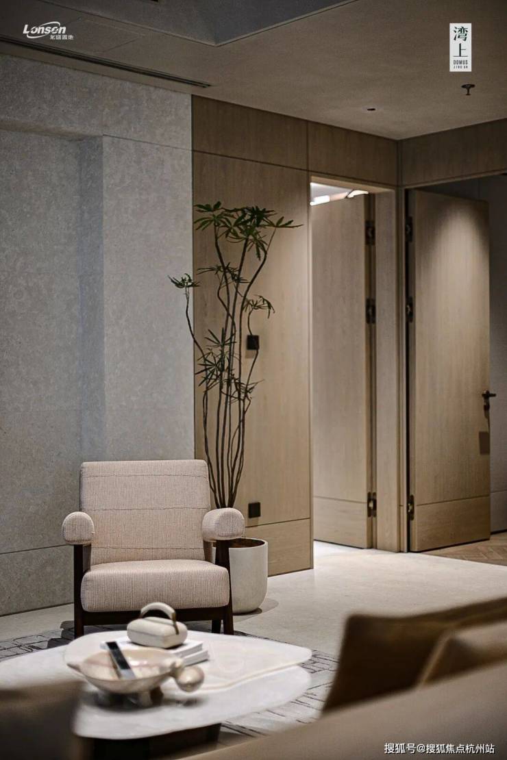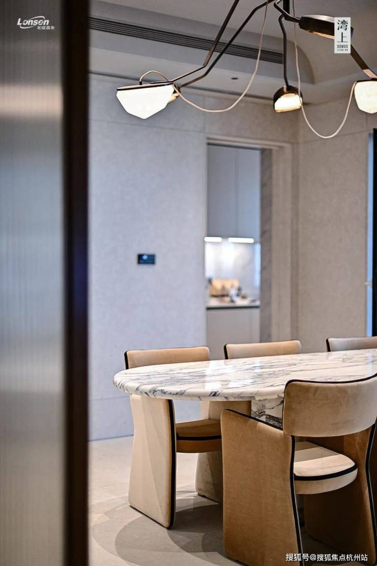 空间层高突破传统住宅达到约3.3米,搭配墙面、地面选用的米白色天然石材,以及顶部特殊的圆弧造型,通透的空间里蕴含着饱满的力量。