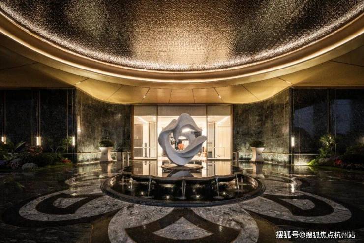 最具仪式感的应该是大门入口处:宽约35米、高约6.5米的寰宇云厅,如殿堂一般气势恢宏,两侧还有挪威蓝翡翠石材景墙对仗而立。