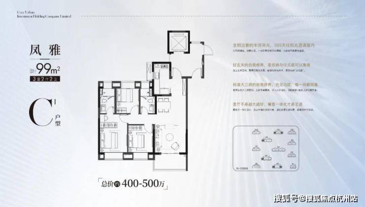 · 建面约99㎡户型则进阶3房2卫,适配对品质有需求的首置或首改客户!