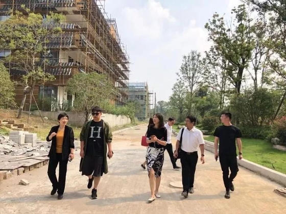 图:余杭区政府工作人员和黄磊一起参观建设中的大师村