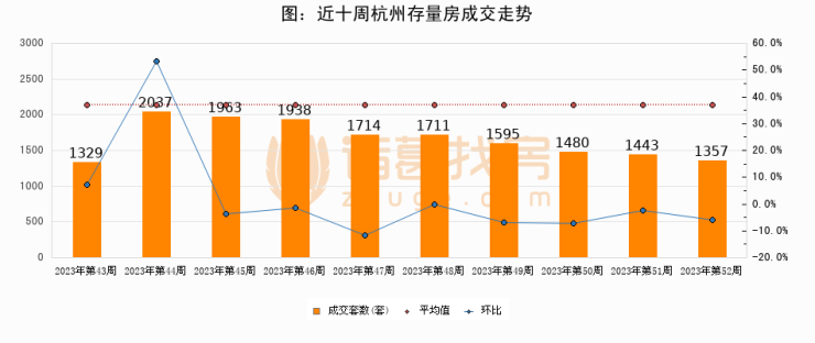 存量房方面,第52周杭州存量房成交1357套,较上周减少86套,环比下降6%。从近十周成交走势来看,周均成交套数为1656套,本周低于平均水平18.1%。