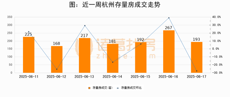 从存量房来看,2025年06月17日杭州存量房单日成交193套,比昨日减少74套,环比下降27.7%。从近一周存量房成交来看,杭州存量房日均成交套数为206套,06月17日单日成交193套,低于近一周平均水平6.3%。
