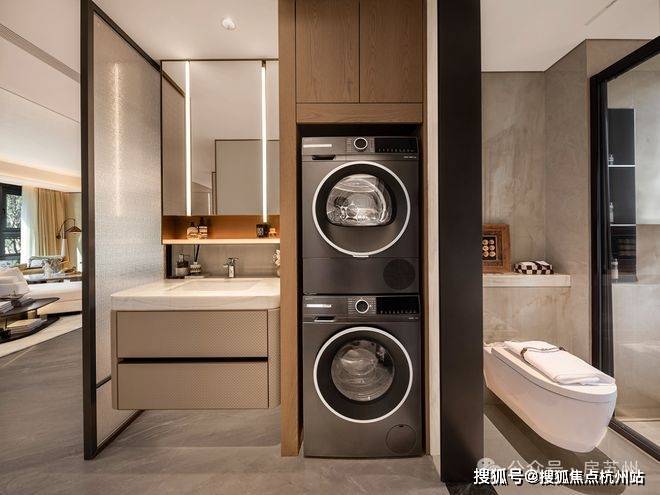 收纳系统是提升生活效率的基础。该户型配置了五大收纳模块,从入户可容纳婴儿车、行李箱的800库玄关,到主卧分层分类的衣柜系统,再到次卫防潮收纳柜和阳台家政柜,基本覆盖了高频生活场景的收纳痛点。